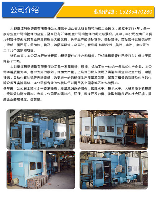 太谷繼紅瑪鋼鑄造有限公司是一家專業(yè)生產(chǎn)瑪鋼管件的企業(yè),至今已有20年的生產(chǎn)瑪鋼管件的歷史與累積。本公司在出口外貿(mào)瑪鋼管件方面尤其專業(yè)并具有相當大的優(yōu)勢,長年生產(chǎn)的德標管件、美標管件英標管件遠銷俄羅斯,伊朗,墨西哥,孟加拉,埃及,哈薩克斯坦,烏克蘭,智利等.包括歐洲、美洲、非洲、中東亞的二十幾個國家和地區(qū)。